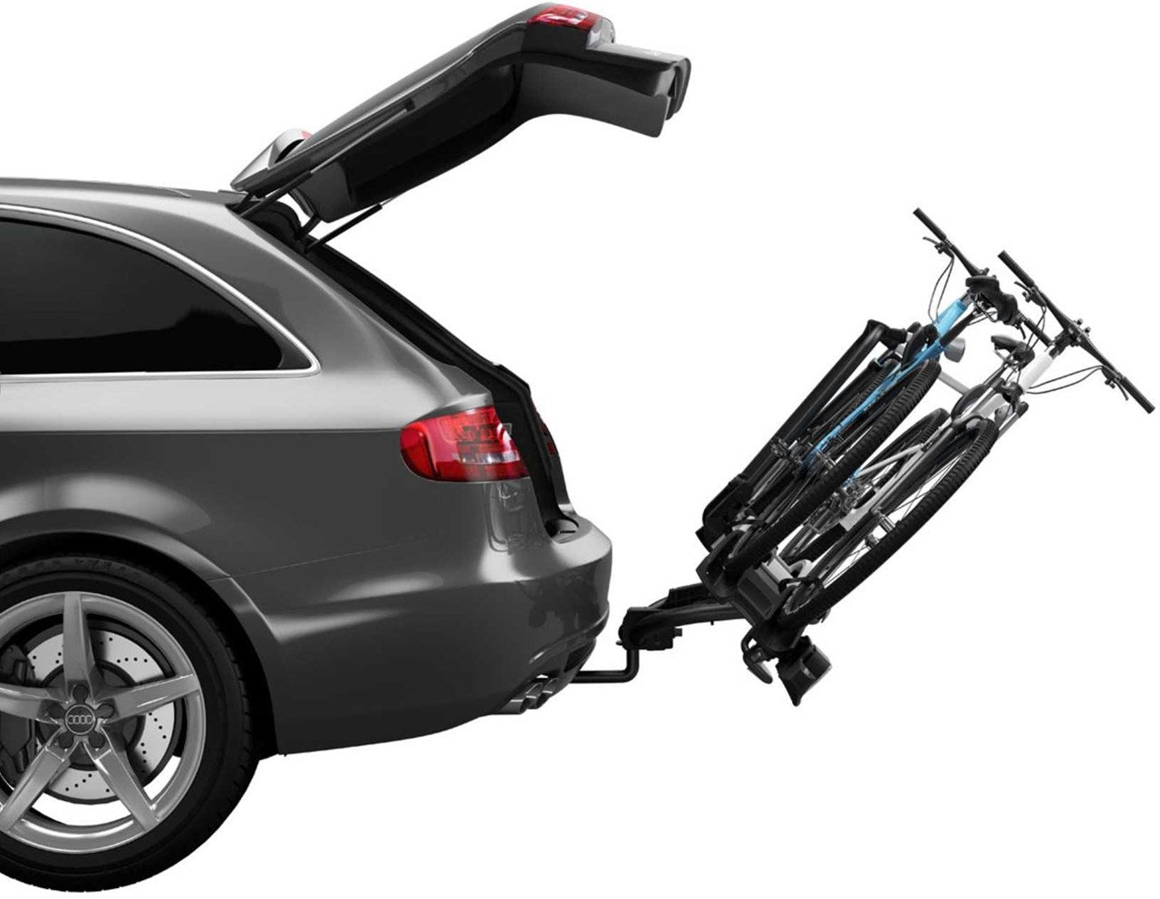 To enable the transport of bicycles with a long wheelbase, the bike carrier is equipped with extendable wheel holders. This allows your bike to fit comfortably and securely on the carrier. If you need to access the luggage in the boot during the journey, you do not have to remove the bikes first. The foot-operated tilt function gives you easy access to your luggage.
